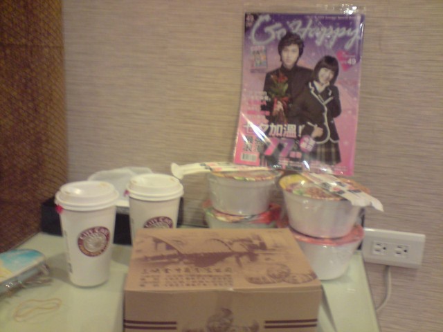 加上7-11買的雜誌和 CITY 咖啡還有朋友帶來的金牛角麵包。
