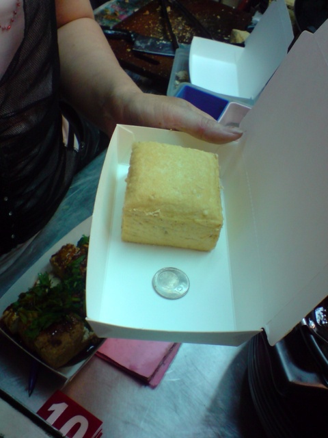 真的超棒的,老闆娘隨手又拿起,未沾汁的臭豆腐然後放上十元硬幣,