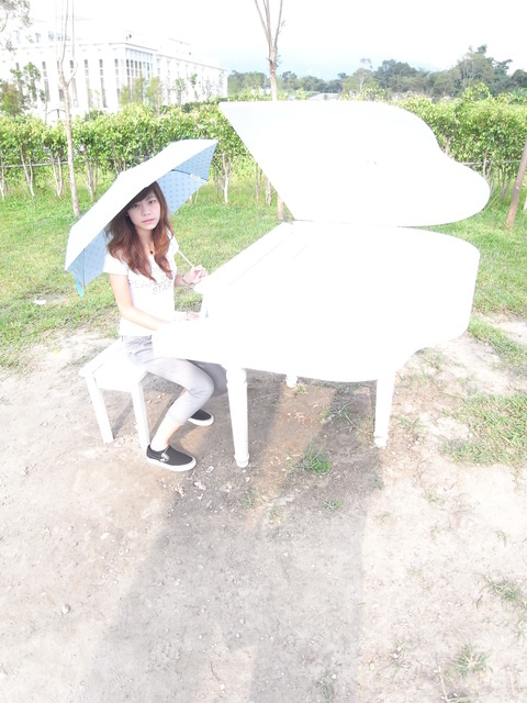 旁邊的草皮上放著一座鋼琴,是假的